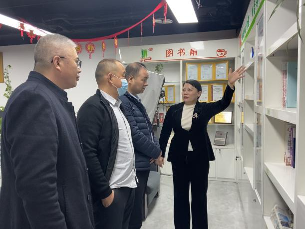 观果华企企业团合影墙和少儿图书角。